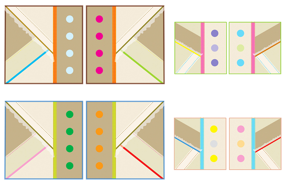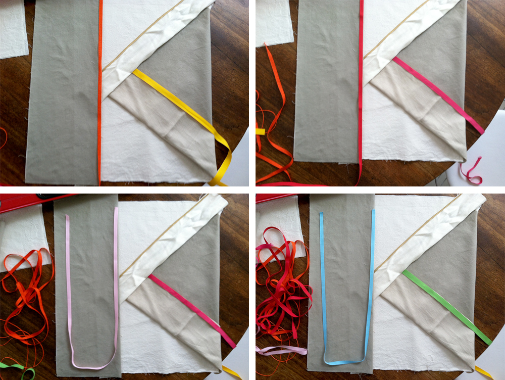 fabrics, ribbons, zippers, 17" x 17" (large), 13" x 13" (small)