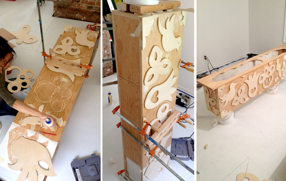 plywood, plastic bags, soil, flowers, plants, 2' x 1' x 4'